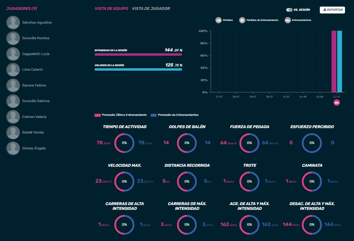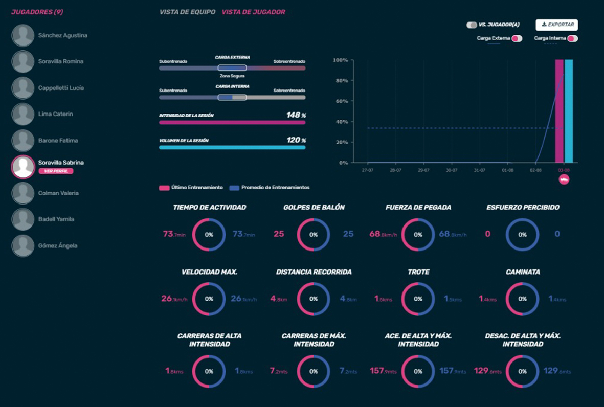 La jugadora con mayor cantidad de aceleraciones a máxima intensidad fue Valeria Colman, con 55 esfuerzos explosivos de 0,85mts promedio; esto da cuenta de la intensidad con la que cada futbolista desarrolla, en un mismo período de tiempo, un juego de espacio reducido.