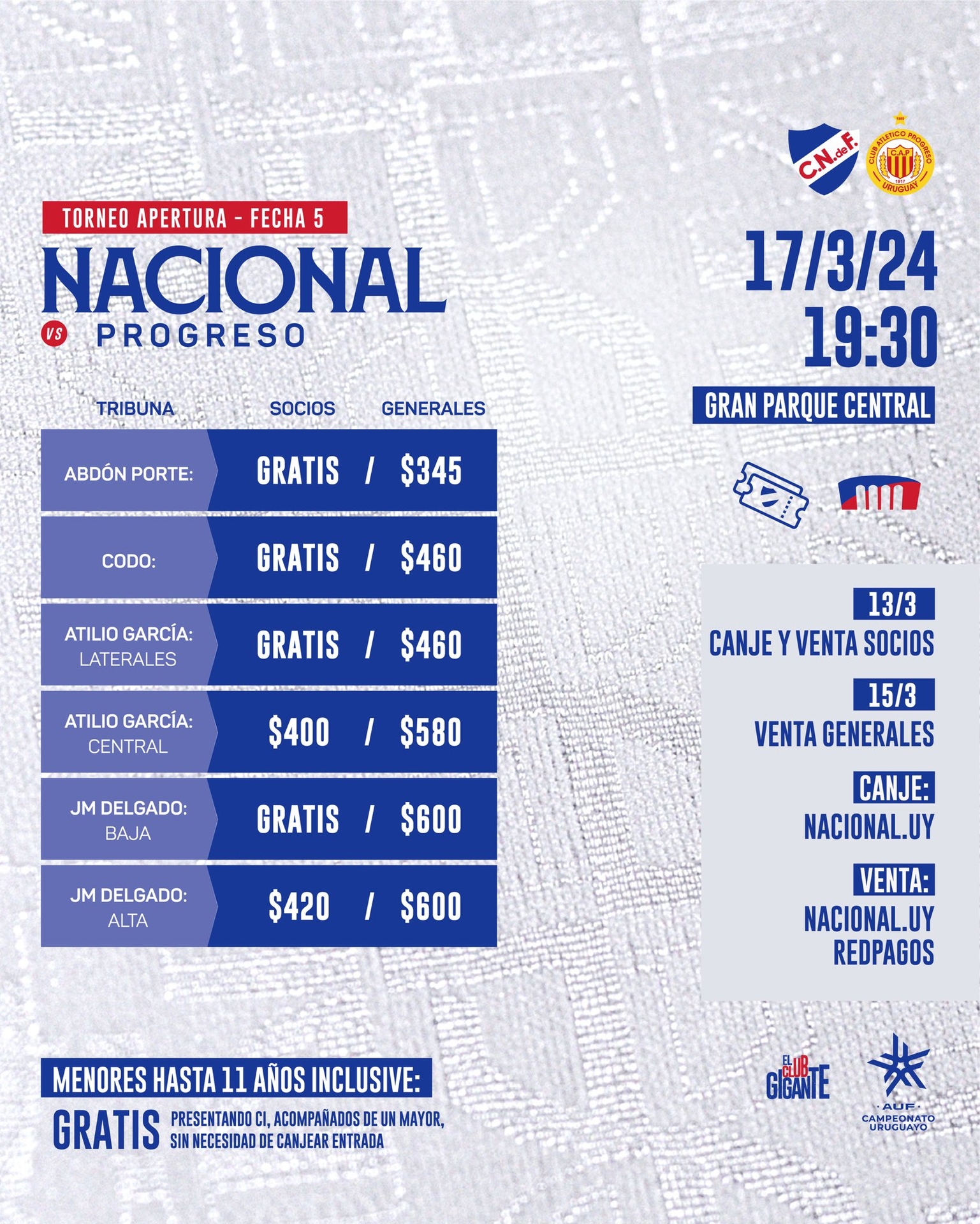 Los menores de hasta 11 años inclusive (acompañados por un mayor y presentando cédula de identidad) ingresarán gratis en todas las tribunas sin necesidad de comprar entrada, sin derecho a ocupar butaca.