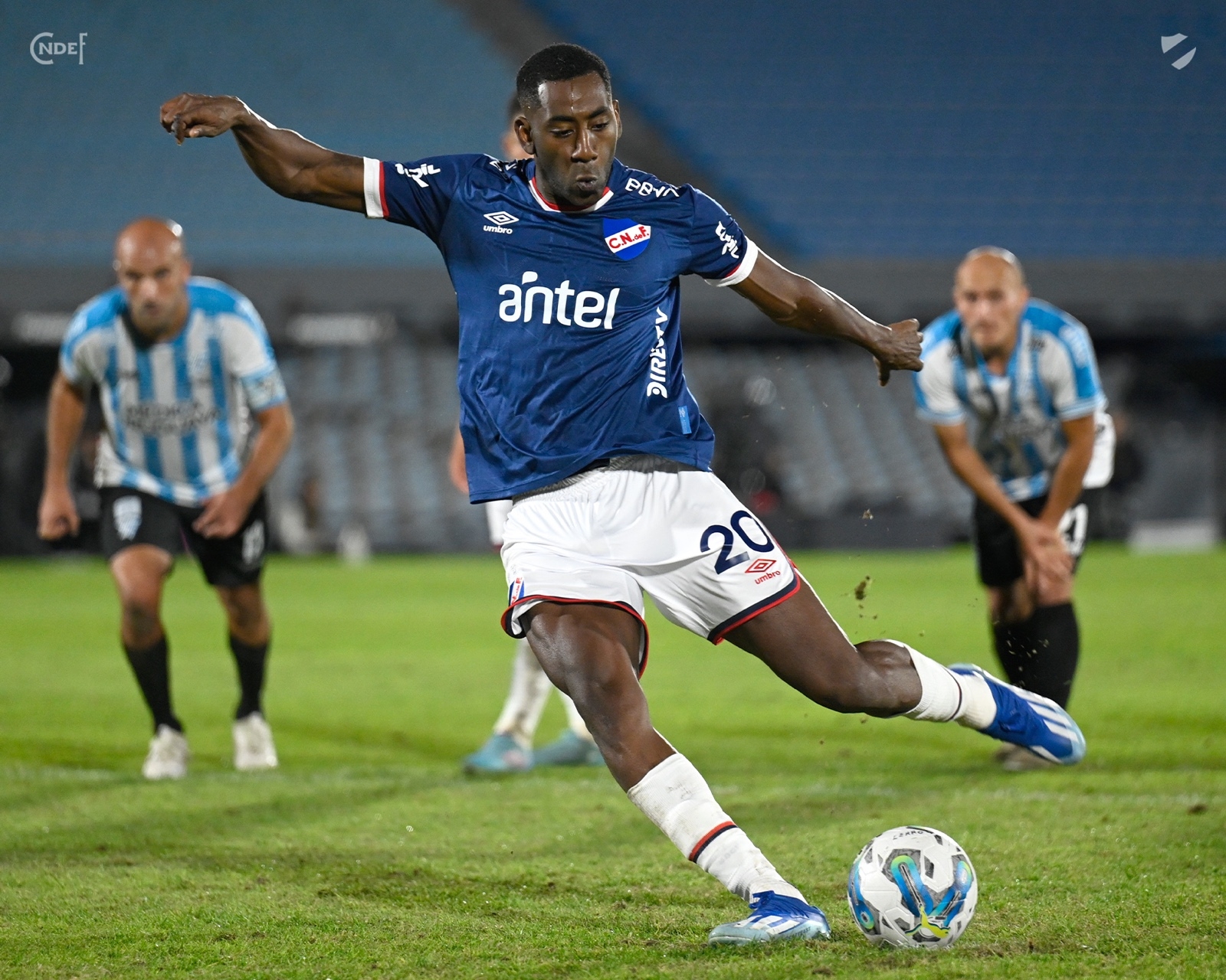 A los 37' llegó una gran jugada personal de "Jere" Recoba que la luchó, asistió a Gonzalo Carneiro para que remate dentro del área, el atacante Tricolor logró sacar un remate, pero al mismo tiempo recibió una dura falta del defensa albiceleste que el árbitro no apreció en tiempo real, pero tras ser llamado por el VAR Tejera revisó la falta y terminó, acertadamente, cobrando tiro penal para Nacional. El encargado de cobrar la pena máxima fue el propio Carneiro, que remató con gran potencia y calidad contra el horizontal izquierdo de Denis para poner el merecido 1 a 0 para el Decano.